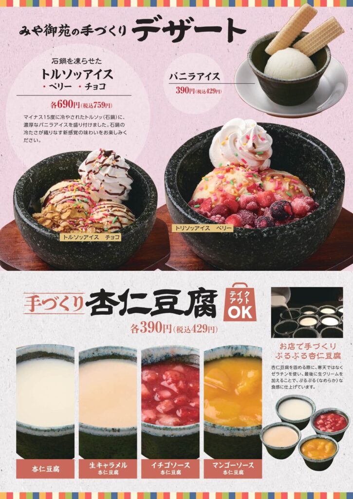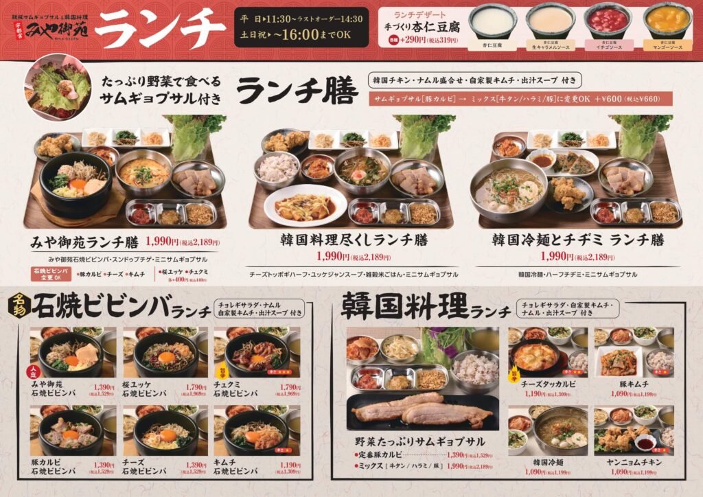 この想いは、私たちみや御苑の変わらぬ願いです。たっぷりの野菜を使った鉄板サムギョプサルをはじめ、韓国鉄板焼、チュクミ、ポッサムなど、バラエティ豊かな韓国料理をご用意いたしました。もちろん、ビビンバも一つ一つ手作りで、変わらない美味しさを提供いたします。韓国のお酒に合うおつまみも充実させ、忘年会にもピッタリの韓国鍋の宴会コースも豊富に取り揃えておりますので、様々なシーンでご利用いただけます。料理はもちろん、お客様とのふれあいを大切にし、心のこもったおもてなしでお客様に笑顔になっていただきたいと考えております。この年末、みや御苑へ、ぜひお越しください。